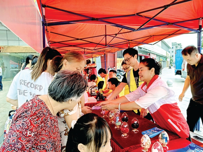 现场还设置了11个不同主题摊位。在健康义诊区,志愿者耐心为老人量血压、测血糖,用专业知识解答他们关于日常保健的种种疑问。在脊椎侧弯检查区和视力验光检查区,志愿者不仅免费检测,还深入讲解儿童脊柱健康知识,以及近视防控、用眼卫生等眼健康知识。在垃圾分类科普区和安全培训区,工作人员则用浅显易懂的语言和鲜活的案例,将垃圾分类、防溺水、反电信诈骗等重要信息传递给群众。“学到知识还拿到了奖品,这个活动挺好玩的。”一名小女孩高兴地说。