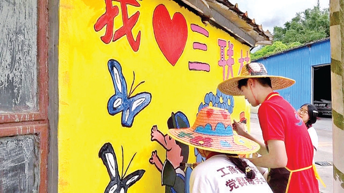 大学生为三联村绘制美丽墙绘
