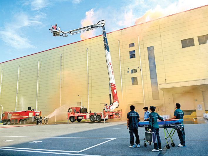 演练现场利用高空云梯车救援被困人员