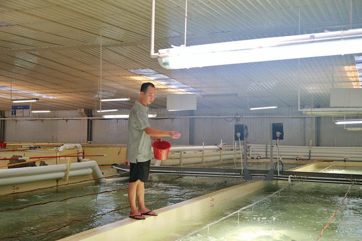 广东省鳇鲸海洋生物科技有限公司养殖基地的工作人员正在喂鱼。