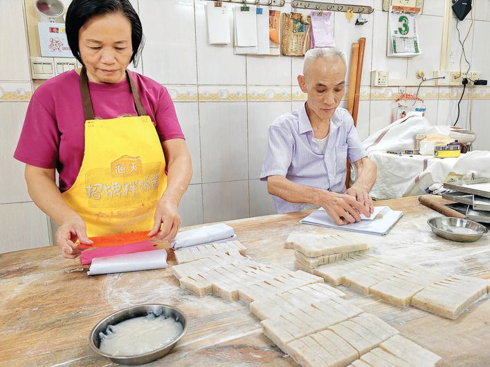 云片糕和月饼一样,都是霞涌本地中秋节必备的点心之一。每年中秋节前一个月,便陆续有街坊邻里或远方的客人来刘志忠店里预订手工月饼和云片糕。