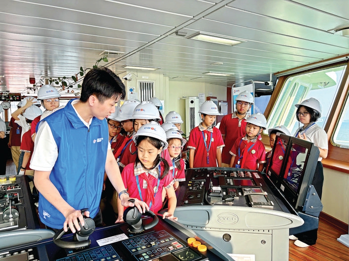 随后,同学们前往油化车间观看化学小实验。奇妙的化学现象吸引了同学们的注意,大家忍不住发出阵阵惊叹声。同学们还在辉固车间看到了水下机器人的“真身”。志愿者将机器人的不同装置比作人的眼睛、耳朵、心脏、四肢等,通过生动活泼的语言让大家更好地理解水下机器人的工作原理。同学们对这个神奇的水下机器人充满了好奇,纷纷提出各种问题,工作人员耐心地一一解答。在登上靠港拖轮参观时,驾驶舱内先进的导航系统和自动化设备令人目不暇接,志愿者们热情地向同学们介绍了各种仪器的功能和操作方法,使他们对海上作业有了更直观的认识。