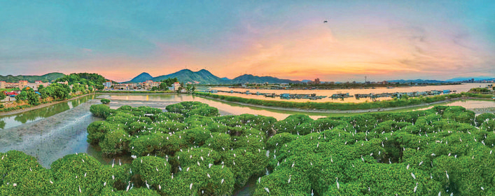 惠东县铁涌镇油麻地村的滩涂上,连片的红树林正在蓬勃生长,郁郁葱葱。此前,当地已建成惠东县好招楼湿地公园一期。如今,红树林成为鹭鸟乐园,每到黄昏,便呈现“落霞与白鹭齐飞”“万鸟归巢”的美丽画面。